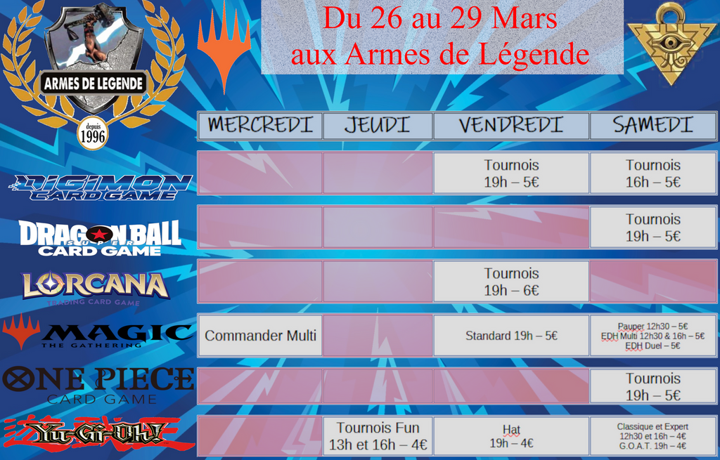 le Mercredi (pour tous les jeux) s'il y a un minimum de 4 joueurs, on met en place un tournoi gratuit avec un booster à gagner pour le premier et une place offerte tirée aléatoirement valable pour le tournoi du Samedi suivant (1 par jour et par tournoi) .